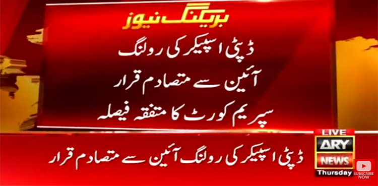 سپریم کورٹ نے 3 اپریل کی ڈپٹی اسپیکر قومی اسمبلی کی رولنگ کو کالعدم قرار دیتے ہوئے تحریک عدم اعتماد کو برقرار رکھا ہے۔ عدالت نے قومی اسمبلی تحلیل کرنے کا فیصلہ مسترد کرتے ہوئے کابینہ کو بھی بحال کر دیا ہے۔