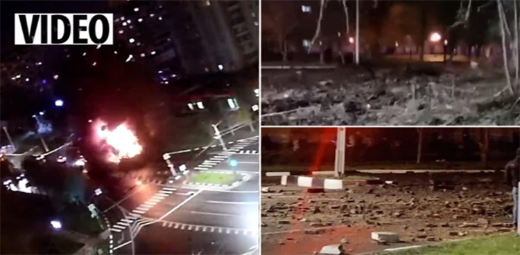 جائے دھماکا کی ویڈیو فوٹیج میں سڑک پر کنکریٹ کے ڈھیر، کئی تباہ شدہ کاریں اور ٹوٹی ہوئی کھڑکیوں والی عمارت کو دکھایا گیا ہے جب کہ ایک دکان کی چھت پر الٹی کار بھی دکھائی دے رہی تھی۔