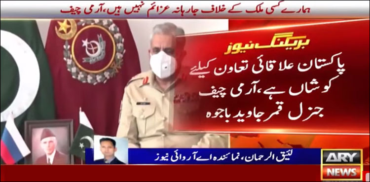 آرمی چیف کا کہنا تھا کہ ہمارے کسی ملک کے خلاف جارحانہ عزائم نہیں ہیں، پاکستان علاقائی تعاون کے لیے کوشاں ہے۔