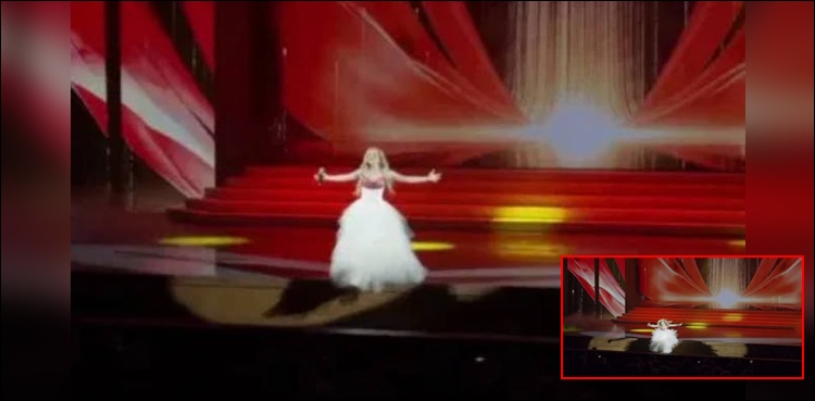 گلوکارہ نیچے بیٹھے آکسٹرا (بینڈ) کے پاس آکر گریں، جنہیں میوزیشنز نے سنبھالا تو انہوں نے دوبارہ گانا شروع کردی۔