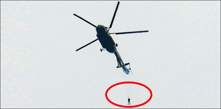 ایسا ہی ایک واقعہ روسی شہر چیٹا میں پیش آیا جہاں ایک فوجی اسکائی ڈائیور ہیلی کاپٹر سے چھلانگ لگاتے ہی مل ایم آئی 8 ہی ملٹری ہیلی کاپٹر میں پھنس گیا، واقعے کی ویڈیو سوشل میڈیا پر وائرل ہوگئی جس میں اسکائی ڈائیور کو ساڑھے 6 ہزار فٹ کی بلندی پر جھولتے دیکھا جاسکتا ہے۔