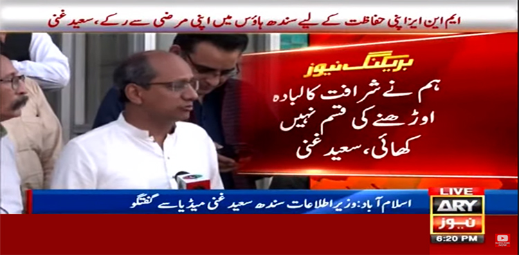 اسلام آباد کے سندھ ہاؤس میں میڈیا سے گفتگو کرتے ہوئے سعید غنی نے کہا کہ وفاقی وزرا دھمکیاں دے رہے ہیں ان کو سمجھانا چاہ رہا ہوں نیازی حکومت ختم ہورہی ہے وفاقی وزرا اتنا کریں جتنا وہ خود برداشت کرسکیں اگر تم لوگ ہمارےاراکین کو روکو گے تو ہم بھی روکیں گے۔