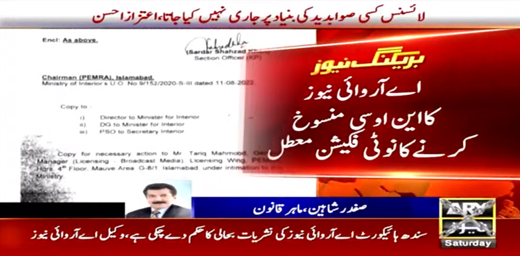 خیال رہے کہ سندھ ہائی کورٹ نے اے آر وائی نیوز کا این او سی منسوخ کرنے کا نوٹی فکیشن معطل کر دیا ہے اور 17 اگست کے لیے فریقین کو نوٹس جاری کر دیا ہے۔