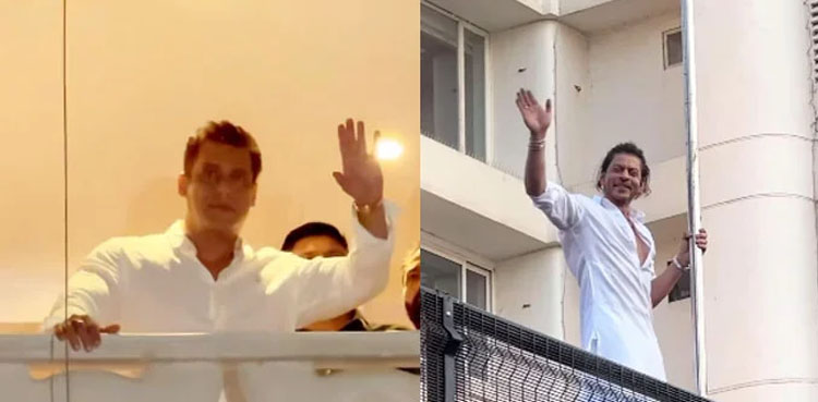 بالی ووڈ اسٹارز شاہ رخ اور سلمان خان نے اپنے مخصوص انداز میں ہاتھ لہرا کر چاہنے والوں کو عید کی مبارک باد پیش کی، سوشل میڈیا پر وائرل ویڈیو میں دونوں خانز سفید شلوار قمیض میں ملبوس دیکھا جاسکتا ہے۔