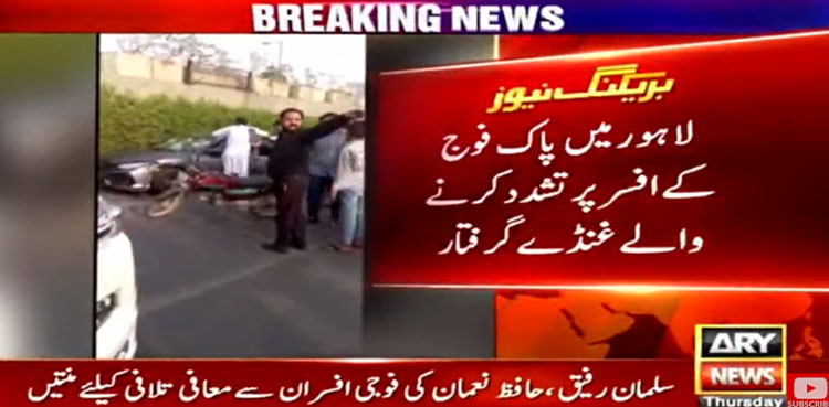 اے آر وائی نیوز کے مطابق لاہور کے علاقے کلمہ چوک کے قریب فوجی افسر پر لینڈ کروزر میں سوار افراد نے تشدد کیا تھا، غنڈے ن لیگ کے رہنما سلمان رفیق اور حافظ نعمان کے ملازم ہیں۔
