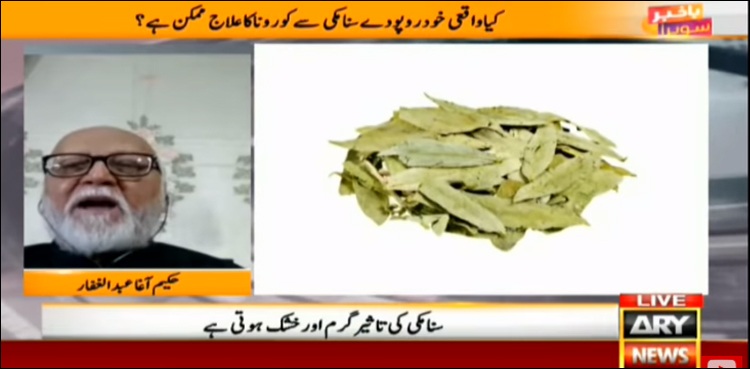 اے آر وائی نیوز کے پروگرام باخبر سویرا میں حکم عبدالغفار کا کہنا تھا کہ سنا مکی سے کرونا علاج ممکن ہونے کی بات بھیڑ چال جیسی ہے، میرے علم کے مطابق دو ہزار سال کی تاریخ میں کسی حکیم یا طبیب نے سینے کے انفیکشن کے لیے سنا مکی جڑی بوٹی کے استعمال کی تجویز نہیں دی ہوگی۔