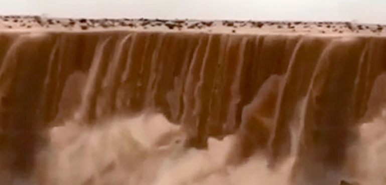 اس ویڈیو میں سفید لباس اور ٹوپی پہنا ایک شخص صحرا کے درمیان ایک بہت بڑے گڑھے کی طرح اشارہ کرتے دکھائی دیتا ہے جس کے اوپر موجود کنارے سے ریت بالکل اسی طرح نیچے گرتی دکھائی دے رہی ہے، جیسے کسی آبشار کا پانی اوپر سے نیچے گرتا ہے۔