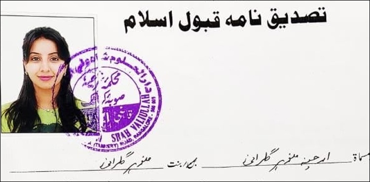 تصدیق نامہ کے مطابق ارچنا منوہر گلرانی بنت منوہرگلرانی عمر 31 سالہ نے بغیرکسی جبر کے با رضا و رغبت اللہ کے ایک ہونے اور محمد رسول اللہ صلی اللہ علیہ و سلم کو آخری نبی ہونے کو مان کر کلمہ شہادت پڑھ کر دین اسلام قبول کیا ہے۔