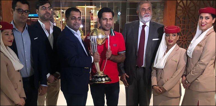 تفصیلات کے مطابق قومی کرکٹ ٹیم کے کپتان سرفراز احمد نے میڈیا سے گفتگو کرتے ہوئے کہا کہ آئی سی سی کرکٹ ورلڈ کپ کی ٹرافی پاکستان میں موجود ہے، لوگ آئیں اور ٹرافی کے ساتھ سیلفیاں بنوائیں، انشاء اللہ ورلڈ کپ جیت کر ٹرافی کو واپس پاکستان ہی لایا جائے گا۔