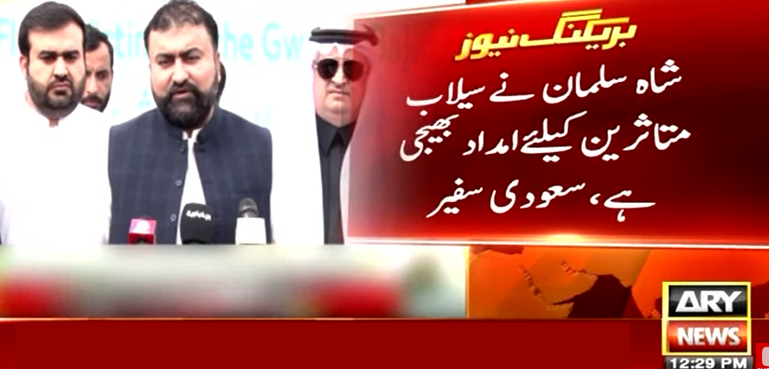 اے آر وائی نیوز کے مطابق گوادر میں گزشتہ دنوں سے بارش اور سیلاب سے ہونے والی تباہی سے متاثرہ افراد کی ہنگامی امداد کے لیے سعودی فرماں رواں شاہ سلمان کی جانب سے بھیجی گئی ہنگامی امداد بلوچستان حکومت کے حوالے کر دی۔