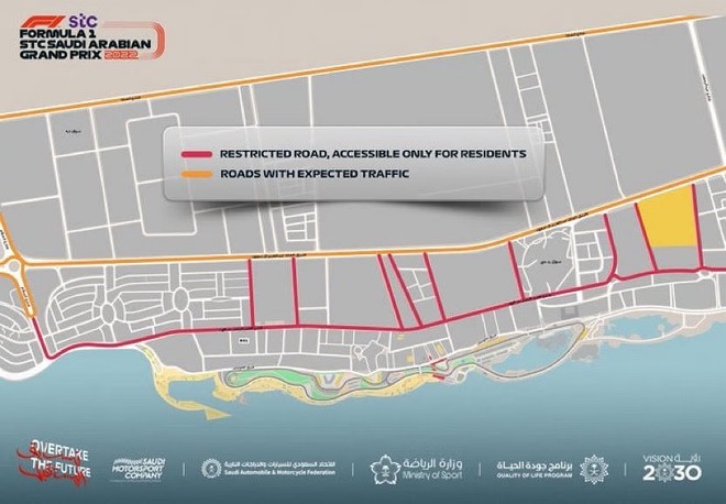 سبق ویب سائٹ کے مطابق دونوں مرکزی شاہراہوں کے درمیان تمام سروس روڈ کو فارمولا ون ریس کے لیے بند کیا جا رہا ہے۔