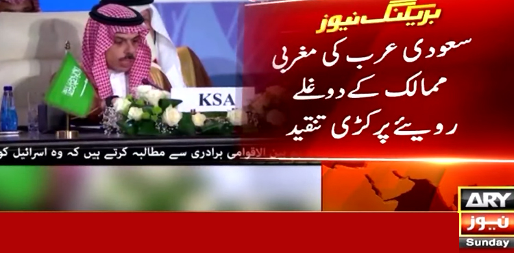 وزیرخارجہ فیصل بن فرحان نے کڑی تنقید کرتے ہوئے کہا کہ مغرب کے دوغلے رویئے کو مسترد کرتے ہیں، اسرائیل کو بین الاقوامی قوانین کا احترام کرنے پر مجبور کیا جائے۔