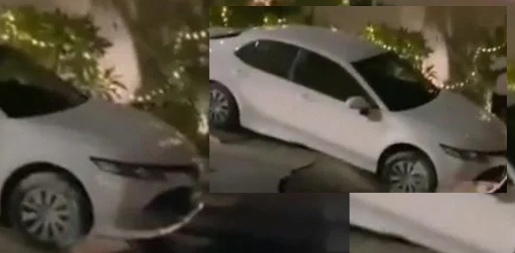 ریاض: سعودی شہر الخبر میں اچانک زمین دھنسنے سے گاڑی گڑھے میں پھنس گئی۔