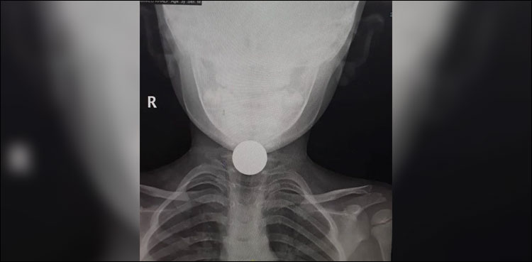 ڈاکٹروں نے بچے کا فوری طور پر ایکسرے کیا تو معلوم ہوا کہ حلق میں سکہ پھنسا ہوا ہے جسے بعدازاں آپریشن کرکے نکالا گیا۔