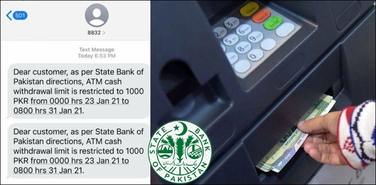 پاکستان کے مختلف شہروں میں بسنے والے صارفین نے یہ شکایت کی تھی کہ انہیں موبائل فون پر اسٹیٹ بینک آف پاکستان (ایس بی پی) کی جانب سے ایک پیغام موصول ہوا ہے جس میں بتایا گیا ہے کہ اکتیس جنوری کے بعد اے ٹی ایم مشین سے ایک ہزار روپے سے زائد رقم نہیں نکالی جاسکے گی۔