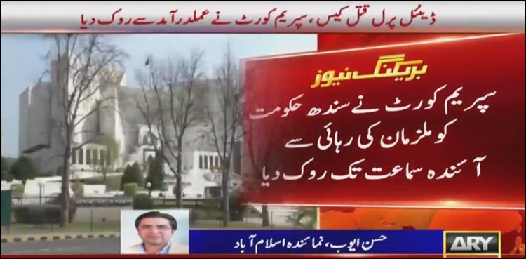 سپریم کورٹ نے حکومت سندھ اورڈینئل پرل کے والدین کی اپیلیں ابتدائی سماعت کے لیے منظور کرتے ہوئے سندھ حکومت کو ملزمان کی رہائی سے آ ئندہ سماعت تک روک دیا۔