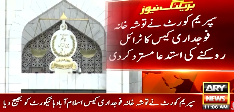 اے آر وائی نیوز کے مطابق سپریم کورٹ نے توشہ خانہ فوجداری کیس روکنے کے حوالے سے چیئرمین پی ٹی آئی کی درخواست کو نمٹاتے ہوئے ٹرائل روکنے کی استدعا مسترد کردی اور کیس کو اسلام آباد ہائیکورٹ کو بھیج دیا ہے اور ریمارکس دیے کہ پُر امید ہیں ہائیکورٹ چیئرمین پی ٹی آئی کی دیگر درخواستوں کے ساتھ یہ کیس بھی سنے گی۔