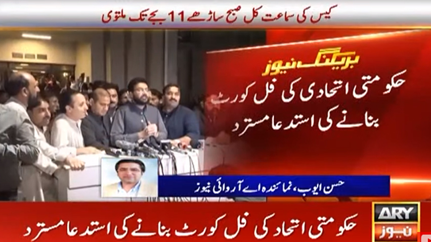 عدالت نے حکومتی اتحاد کی فل کورٹ کی درخواست مسترد کرتے ہوئے کہا کہ موجودہ بینچ ہی کیس کی سماعت کرے گا۔ سپریم کورٹ نے اپنے فیصلہ میں کہا کہ وکلا نے فل کورٹ بنانے اور میرٹ پر دلائل دیئے، ڈپٹی اسپیکر نے 22 جولائی کو رولنگ میں پارٹی سربراہ کے حق میں فیصلہ دیا، قانونی سوال ہے کہ ارکان کو ہدایت پارٹی سربراہ دے سکتا ہے یا نہیں۔