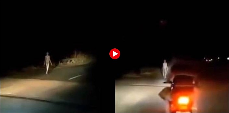 ویڈیو میں دیکھا جاسکتا ہے کہ خلائی مخلوق کی طرح کوئی چلتے ہوئے جارہا ہے اور موٹر سائیکل سوار اس پر لائٹ مار رہے ہیں۔