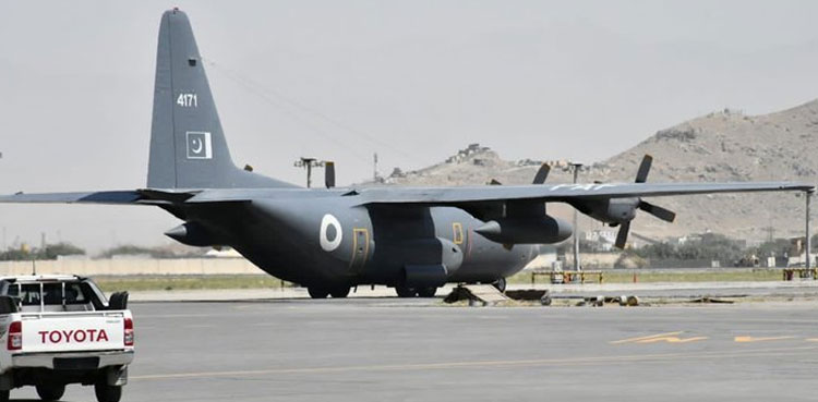 گذشتہ روز پاکستان کی جانب سے انسانی ہمدردی کے تحت امدادی سامان لے جانے والا سی ون تھرٹی طیارہ افغانستان پہنچا تھا ، سامان میں 10 ٹن آٹا، ڈیڑھ ٹن گھی اور ادویات کی بڑی مقدار شامل تھی۔