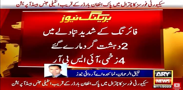 پاک فوج کے شعبہ تعلقات عامہ (آئی ایس پی آر) کے مطابق سیکیورٹی فورسز نے چترال میں پاک افغان بارڈر کے قریب انٹیلیجنس بیسڈ آپریشن کیا، فائرنگ کے شدید تبادلے میں 2 دہشت گرد مارے گئے اور 4 زخمی ہوگئے۔
