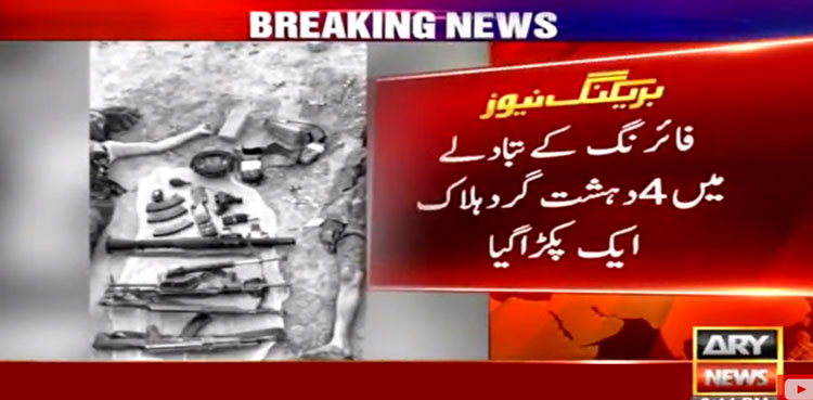 پاک فوج کے شعبہ تعلقات عامہ (آئی ایس پی آر) کے مطابق لکی مروت میں آرمی، پولیس نے دہشت گردوں کی مبینہ موجودگی پر آپریشن کیا، فائرنگ کے تبادلے میں چار دہشت گرد ہلاک ہوگئے اور ایک پکڑا گیا۔