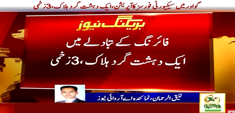 اے آر وائی نیوز کے مطابق گوادر میں دہشت گردوں کی موجودگی کی اطلاع پر سیکیورٹی فورسز نے آپریشن کیا، اس دوران دہشتگردوں اور سیکیورٹی فورسز کے درمیان فائرنگ کا تبادلہ بھی ہوا جس میں ایک دہشتگرد مارا گیا جب کہ 3 زخمی ہوگئے۔