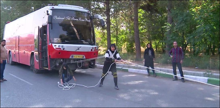 تفصیلات کے مطابق ایران سے تعلق رکھنے والی 38 سالہ خاتون مریم ہمتی نے 18 ٹن وزنی بس کو کئی میٹر دور تک کھینچ کر دیکھنے والوں کو حیران کردیا۔