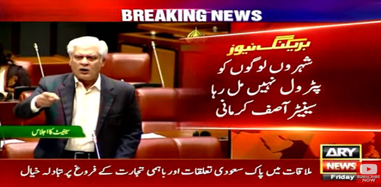 سینیٹ اجلاس میں اپنی دھواں دار تقریر میں لیگی سینیٹر آصف کرمانی بھی ملک میں پیٹرولیم کی مصنوعی قلت پر بھڑک اٹھے اور کہا کہ دس دنوں میں دوبار اس صورتحال کا سامنا کرنا پڑا۔