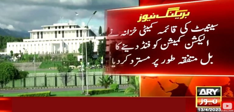 قومی اسمبلی کے بعد سینیٹ کی قائمہ کمیٹی برائے خزانہ نے بھی پنجاب اور کے پی میں انتخابات کے لیے الیکشن کمیشن کو فنڈز دینے کا بل مسترد کردیا ہے۔