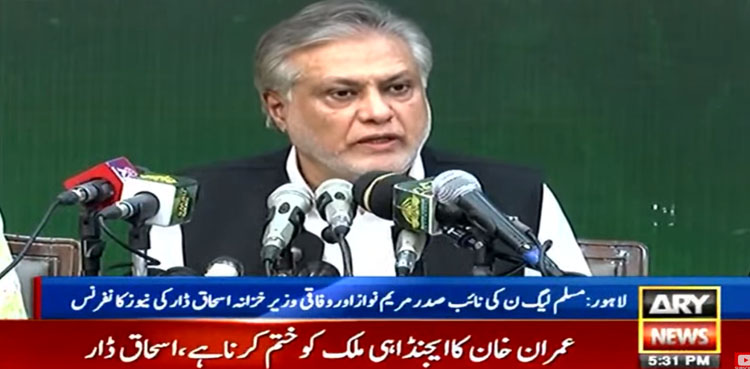اے آر وائی نیوز کے مطابق وزیر خزانہ اسحاق ڈار نے مسلم لیگ ن کی مرکزی نائب صدر مریم نواز کے ہمراہ مشترکہ پریس کانفرنس کرتے ہوئے کہا کہ عمران خان نے آفیشل سیکرٹ ایکٹ اور آئین کی خلاف ورزی کی ان کے چار سالہ دور میں تباہی کا ذمہ دار کون ہے۔
