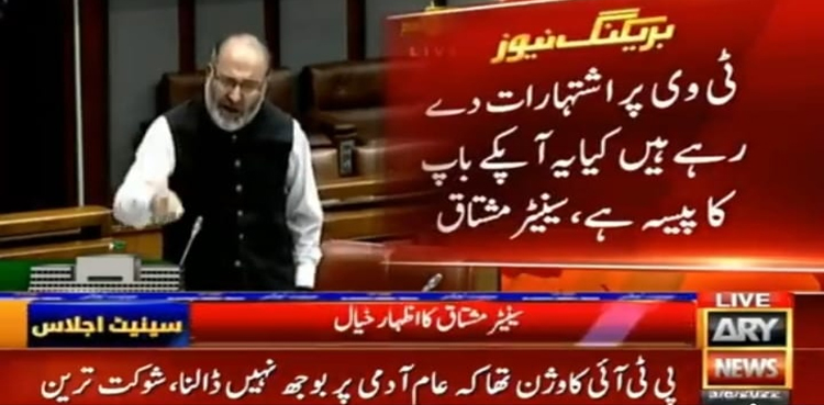 مشتاق احمد خان نے کہا کہ اگر حکومت کے پاس زہر کھانے کے پیسے نہیں تو اخباروں میں اشتہارات کیسے دیے، کیا یہ تمہارے باپ کے پیسوں سے چھپوائے گئے۔
