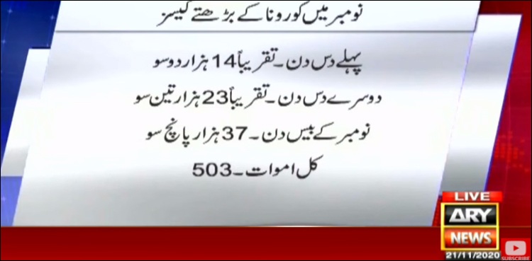 دوسری جانب نیشنل کمانڈ اینڈ آپریشن سینٹر (این سی او سی) کی جانب سے جاری کردہ اعداد و شمار میں بتایا گیا ہے کہ گزشتہ چوبیس گھنٹوں کے دوران کرونا کے مزید 2843 کیسز رپورٹ ہوئے جبکہ 42 مریضوں کی اموات ہوئیں۔