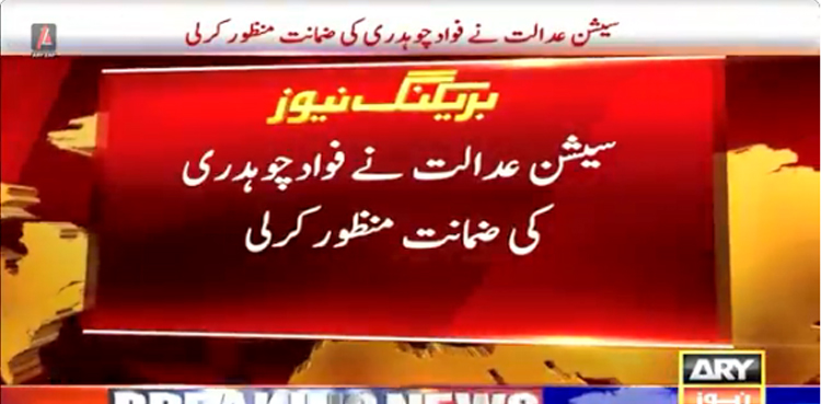 سیشن عدالت نے فوادچوہدری کی ضمانت منظور کرلی ، عدالت نے 20ہزار کےضمانتی مچلکوں کے عوض ضمانت منظور کی۔