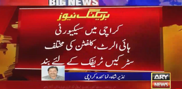 تفصیلات کے مطابق دہشت گردی کے خطرے کے پیش نظر کراچی کے مختلف علاقوں میں سیکیورٹی ہائی الرٹ کردی گئی اور کلفٹن کے علاقے میں متعدد راستوں کو ٹریفک کے لئے بند کردیا گیا ہے۔
