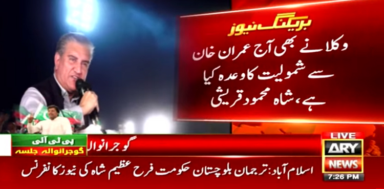 شاہ محمود قریشی نے کہا کہ جلسہ گاہ بھر چکا ہے اور اتنی ہی تعداد جلسہ گاہ سے باہر ہے، وکلا نے بھی آج عمران خان سے شمولیت کا وعدہ کیا ہے، تحریک پاکستان کے بعد ایک نیا سیاسی طوفان ابھرتا نظر آ رہا ہے۔
