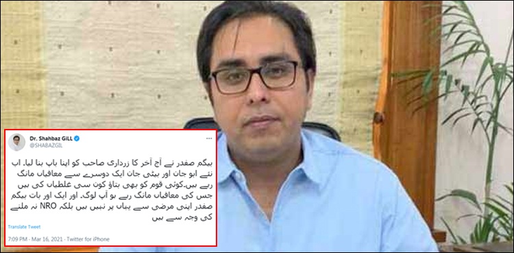 سماجی رابطے کی ویب سائٹ پر وزیر اعظم کے معاونِ خصوصی نے لکھا کہ ’بیگم صفدر نے آخر کار زرداری صاحب کو اپنا والد بنا لیا، نئے ابو اور بیٹی ایک دوسرے سے معافیاں مانگ رہے ہیں‘۔