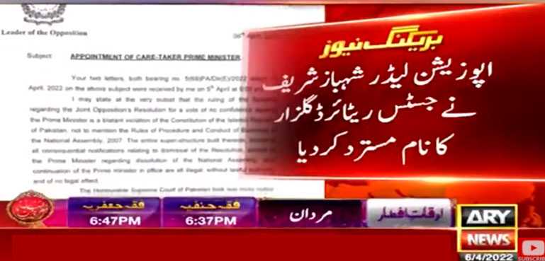 شہباز شریف نے نگراں وزیراعظم کیلیے تجویز کردہ جسٹس ریٹائرڈ گلزار احمد کا نام مسترد کردیا ہے اور اس حواسے صدر مملکت کو خط بھی لکھ دیا ہے۔