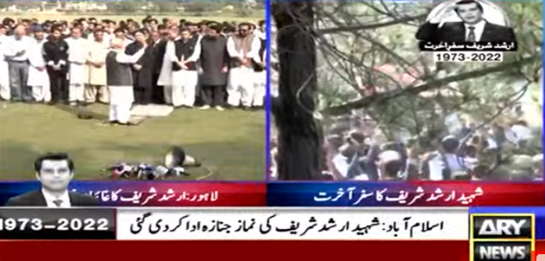 کراچی میں اے آر وائی نیوز کے ہیڈ آفس کے باہر شہید ارشد شریف کی غائبانہ نماز جنازہ ادا کی گئی جس میں اسٹاف ممبران سمیت صحافیوں، مقامی سیاسی وسماجی رہنما، مختلف شعبہ زندگی سے تعلق رکھنے والے افراد کی بڑی تعداد نے شرکت کی۔
