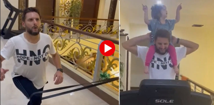 ویڈیو میں دیکھا جاسکتا ہے کہ شاہد آفریدی بیٹی کے ساتھ ایکسرسائز کرنے میں مصروف ہیں مداحوں کو بھی ان کا یہ انداز خوب بھایا۔