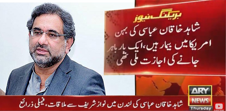 شاہدخاقان عباسی گزشتہ شب لندن پہنچےتھے وہ حکومت سےخصوصی اجازت لے کربیرون ملک گئے تھے شاہدخاقان عباسی بہن کی عیادت کیلئے امریکا گئے تھے۔