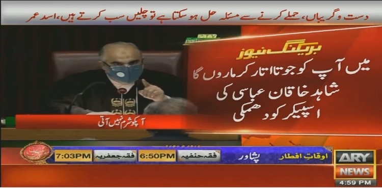 اسلام آباد: قومی اسمبلی کے اہم ترین اجلاس میں سابق وزیراعظم شاہد خاقان آپے سے باہر ہوگئے اور اسپیکر قومی اسمبلی کو دھمکی دے ڈالی۔