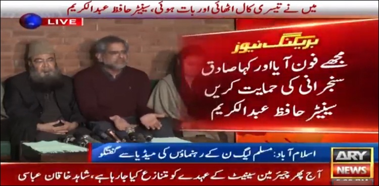 مسلم لیگ ن کے سینیٹر حافظ عبدالکریم نے شاہد خاقان عباسی کے ہمراہ نیوز کانفرنس کرتے ہوئے کہا کہ مجھے تین بار واٹس ایپ کالز آئیں اور حکومتی امیدوار کو ووٹ دینے کو کہا گیا۔