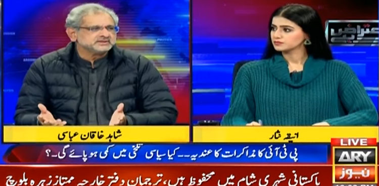 اے آر وائی کے پروگرام اعتراض ہے میں گفتگو کرتے ہوئے شاہد خاقان عباسی کا کہنا تھا کہ کوئی مذاکرات کے لیے تیار نہیں، نہ عوام کی پرواہ ہے نہ ملک کی، پی ٹی آئی جب بھی مذاکرات کرتی ہے آخرمیں کہتی ہے بانی نہیں مانے، مذاکرات جس نے بھی کرنے ہیں براہ راست بانی پی ٹی آئی سے کریں۔