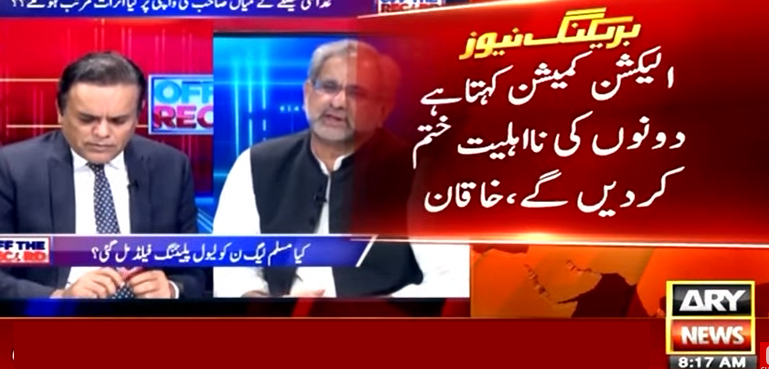 مسلم لیگ ن کے مرکزی رہنما اور سابق وزیراعظم شاہد خاقان عباسی کے مطابق الیکشن کمیشن کہتا ہے کہ ساڑھے چار ماہ میں نواز شریف اور چیئرمین پی ٹی آئی کی نا اہلی ختم کر دیں گے۔