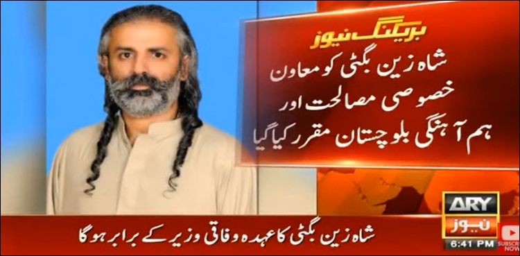 اے آر وائی نیوز کے مطابق وزیراعظم عمران خان نے بلوچستان سے تعلق رکھنے والی اپنی اتحادی جماعت جمہوری وطن پارٹی کے رکن قومی اسمبلی شاہ زین بگٹی کو معاونِ خصوصی مقرر کرنے کا حکم دیا۔