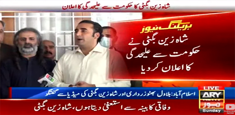 تفصیلات کے مطابق شاہ زین بگٹی نے وفاقی کابینہ سے مستعفی ہونے کا اعلان چیئرمین پاکستان پیپلز پارٹی بلاول بھٹو زرداری سے ملاقات کے بعد کیا۔
