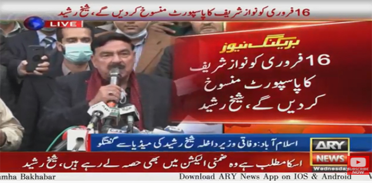 میڈیا سے گفتگو میں شیخ رشید نے اعلان کیا کہ سولہ فروری کو نواز شریف کا پاسپورٹ منسوخ کردیں گے۔