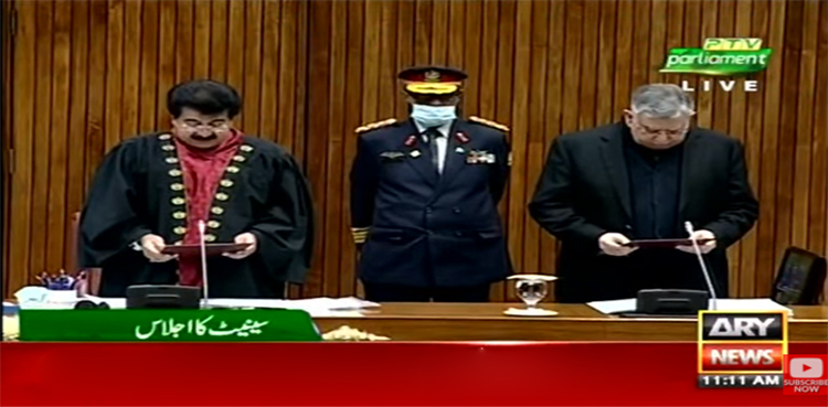 تفصیلات کے مطابق ایوان بالا کا اجلاس چیئرمین سینیٹ صادق سنجرانی کی زیر صدارت ہوا، جہاں خیبر پختون خوا سے سینیٹر منتخب ہونے والے شوکت ترین نے حلف اٹھایا، صادق سنجرانی نے ان سے حلف لیا، اس موقع پر حکومتی ارکان کی جانب سے ڈیسک بجاکر انہیں مبارک باد دی گئی۔
