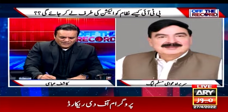 اے آر وائی نیوز کے پروگرام ”آف دی ریکارڈ“ میں گفتگو کرتے ہوئے شیخ ریشد نے کہا کہ یہ ہمیں کہتے تھے، ہم انہیں کہتے ہیں کہ آپ سلیکٹڈ بھی ہو اور امپورٹڈ بھی ہو، یہ ہمیں کہتے تھے الیکشن کرائیں، ہم کہتے تھے الیکشن وقت پر ہوں گے، آج ہم انہیں کہتے ہیں کہ الیکشن کرائیں یہ کہتے ہیں وقت پر کرائیں گے۔
